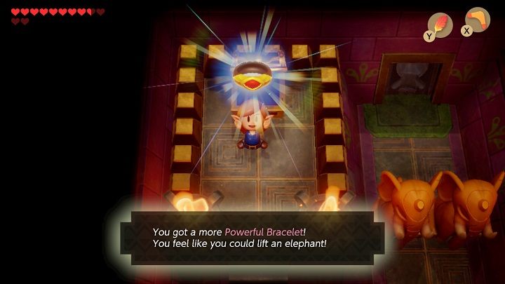 Go through the underground tunnel and climb the last ladder to the higher level of the shrine. To open the door in the next room you have to kill all the enemies. Disappearing monsters with green hats can be tough to defeat. Stan in front of the place where they appear, cover yourself with a shield and as soon as they emerge throw a boomerang at them. Go to the next room and take the More Powerful Bracelet form the chest. Remove one of the elephant statues so that you can go through the revolving door.