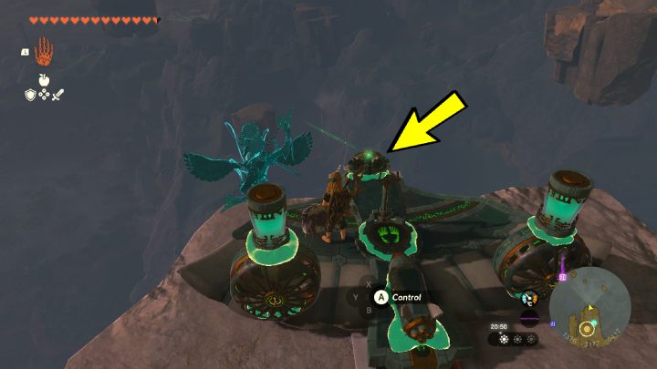 Pick up the mask, from which a green beam of light is emanating. Build a flying vehicle and attach the mask to it. Fly to the place the light beam is showing you. Place the mask on the pedestal and wait for the door to Tobio's Hollow Chasm to open. Pick up the mask and put it on the designated spot. Jump down into the Depths.