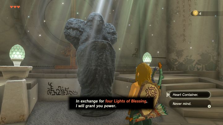 Shrines are locations where you will have to solve many different puzzles. There are 151 of them in the game. After completing them, players unlock a fast travel point in the place where the Shrine was located and receive an item - Light of Blessing. After collecting four of them, you will be able to approach the smiling statue and exchange it for an extra heart.