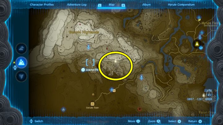 Go to the next room and head down. Talk to Impa and Cado. Go back up and use the Camera to take a photo of the map. Find the remaining 10 geoglyphs and collect all Tears of the Dragon.