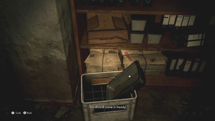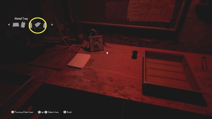 You will need one more thing to develop the photo - a metal tray. You will find it by the wooden shelf where the newspapers are lying.