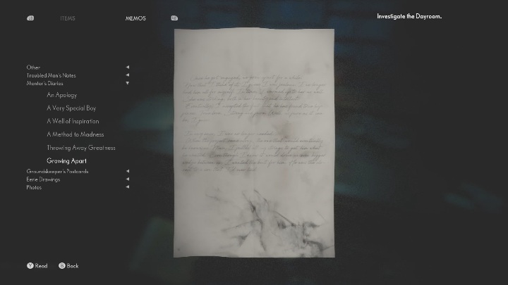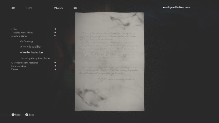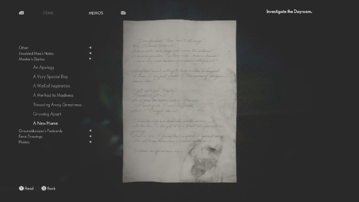 Location: This note from the mentor's diary is in the room you reach by exiting the dayroom and going down the stairs.