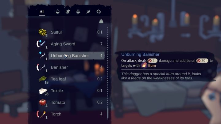 In The Serpent Rogue you can find unique weapons and upgrade the ordinary ones. This way, you can significantly change the combat and shift the power advantage. Try to adjust to the environment or carry different weapons/tools/potions with you and switch between them. For example: the weapon in the screenshot deals additional damage against enemies that are on fire. Use the torch first and switch to this weapon to deal increased damage.