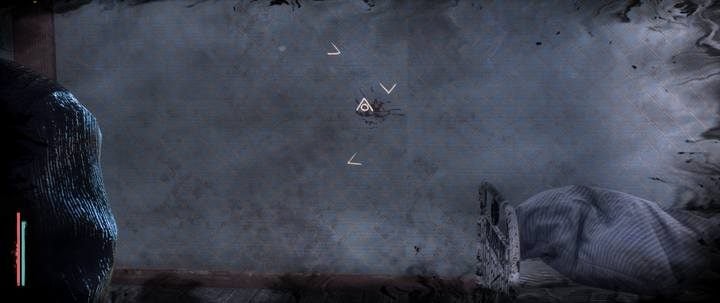 Inside, look at the yellow figure on the table with your Mind's Eye. Under it you will find the key. Go right through the door near the toilet (take a sheet of paper from the frame) and use the Mind's Eye inside. After moving upstairs, reuse the Eye on the bloodstain wall. You'll be attacked by three tormentors as an illusion - have your weapon on standby. Take the books to your client.
