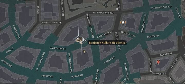 The mission point will lead you to the center of the Advent district. You'll find the house on Carpenter Street between Benevolent Tides Road and Hawthorne Avenue. You have to take a boat to get to the building.