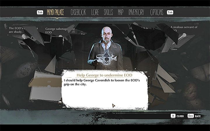 After hearing Cavendish's arguments, you will have time to think about his proposal. You immediately unlock some evidence - Cavendish Family Disintegration. Open the Mind Palace. You want to reach the conclusion that the activities of the EOD are harmful and that you need to help Cavendish to destroy them at any cost.