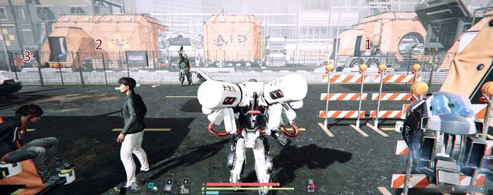 At this point, cross the gate to the street. There you'll find two police robots and two military robots, attached to the walls. Don't begin a fight against multiple enemies at once. Your target is an orange tent on the street.