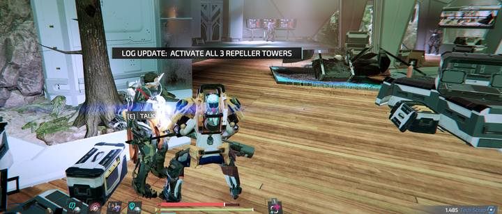 After activating all repellers, return to Hawke (and deposit tech scrap). The boss arena is located in front of the base, where the square used to be. Now there's an abyss. Just jump into the arena, you won't be injured. As the boss is a robot, it is worth using a weapon with additional damage from nanites or electricity.