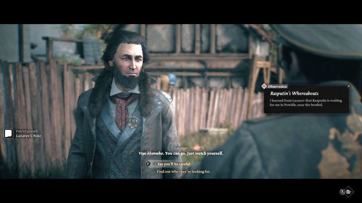 - When he tries to leave Faldjey's apartment, Wiktor will be stopped by a lieutenant. The conversation with him will be interrupted by Lazarev. After showing him the documents, you will receive a message from Rasputin and unlock the Rasputin's Whereabouts observation. Also avoid fighting with the police.