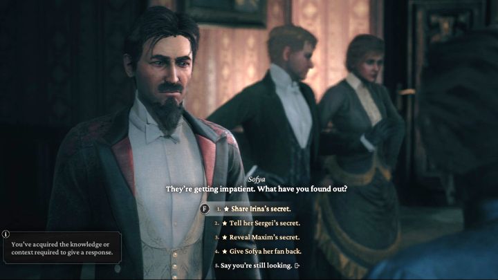 - Sofya Skalon is in the central part of the apartment - talk to her. She will ask Wiktor to reveal the secrets of her guests. Search the apartment again to discover new observations - Party Game, Decorative Vase, Empty glass, Decorative Sofa and Plucked Leaves. By investigating them, you'll uncover new conclusions - The Admirer's Secrets, The Loner's Secrets, and A Friend's Secrets.