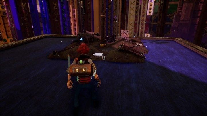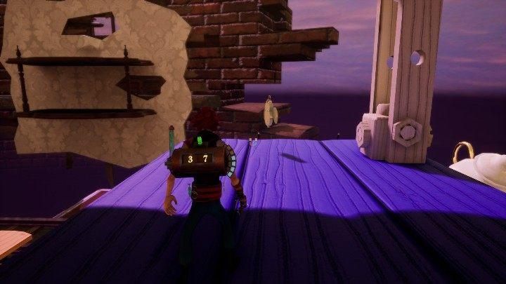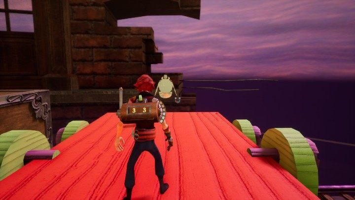 Traveling on the third level, you'll find purple platforms. When you follow them, you will hit the clock. It is located at the end of the platform. Around it you can see the shelf and jug.