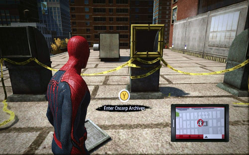 Your next target is the Oscorp Archives in the north. Get onto the roof of the marked building and use the ventilation shaft found there.