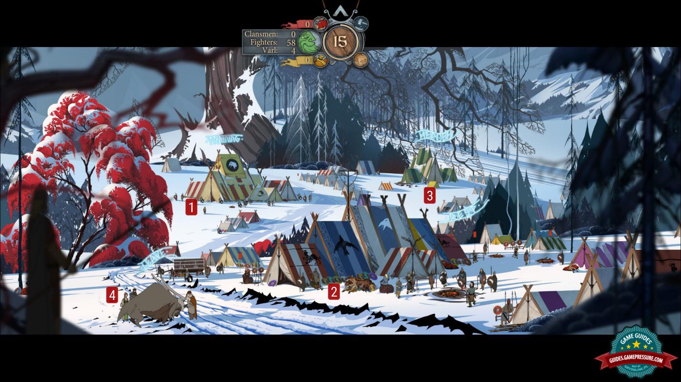 You can pitch n encampment at virtually any moment. IN the encampment, you rest and regenerate your characters and enhance the morale of the entire caravan. During the game, you will also see training tents (number 1). They do not appear each time, but it is a good idea to use one, if only it appears. Thanks to training and completing special objectives, you will be rewarded with renown. In the encampment, you can also view your characters, using the special characters' tent. Here, you can level them up, give them items and assign additional statistics points to them. Using icon number 4, you can leave the encampment and continue your journey.