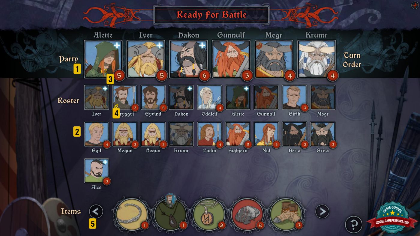 The screenshot presents the character selection main window that pops up before a battle. Number one informs you of which characters have been assigned to the main party whose job it is to face the enemies. The character that you place in the first position will make a move as the first. Of course, you can modify that in any way you want. Number two is a list of all the heroes available to you that you can assign to the main party. Icon three indicates the level of a given character. If there is a plus sign appearing next to it, this means that you can level this character up. Icons 4 and 5 inform you of the items that you have. If there is a icon of a gold ring appearing next to the portrait, this means that this character is in the possession of that item. You can modify items at any moment and you can also give them to other characters. Also, an important matter, when it comes to items, is the required character level. This means that a character with level 5 will be unable to use a item that requires level 6, or higher.