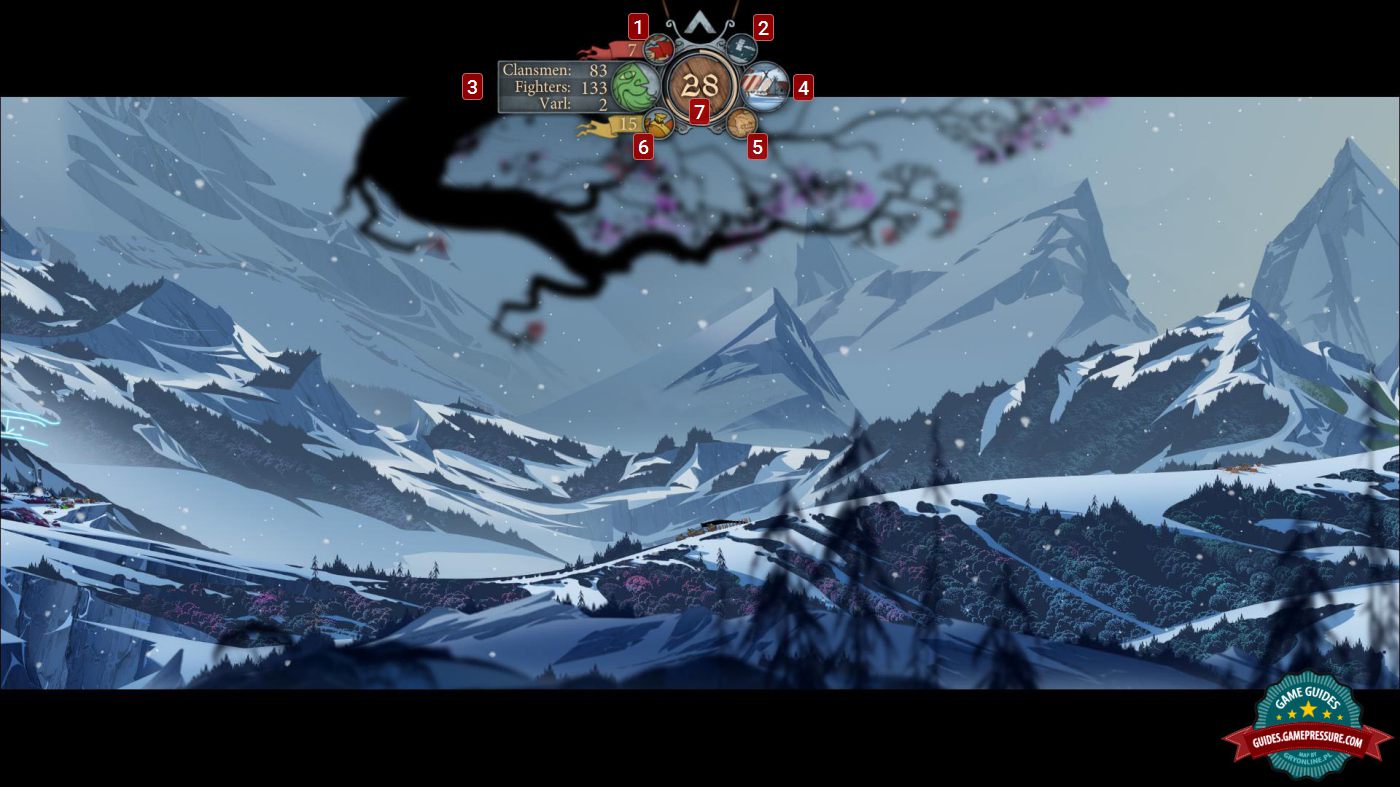You will be seeing the caravan window for a great part of the game. This is here that you will be taking various decisions that will then affect your adventures. There are several interesting options in the caravan window and you need to remember about them at all times. The most important one, of course, is the current state of your supplies (number 6). To learn more about supplies, see the chapter devoted to this topic. At any moment, you can pitch a camp (number 4) and rest, which directly translates into the improved mood/morale of the entire caravan (number 3).