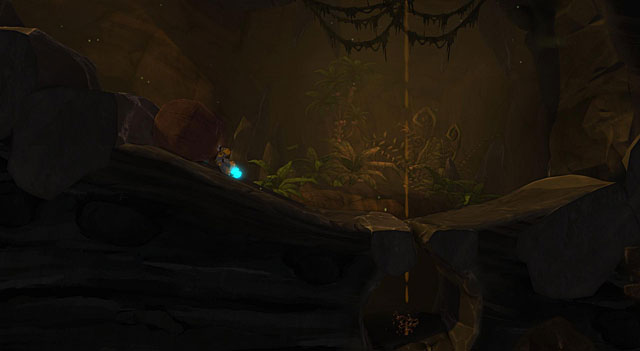 Go right. Behind the Time Machine you will find a ladder leading up. Climb it and afterwards move to the left. Your path will be once again blocked by stalactites and stalagmites. Phase through them to the other side. Eventually you should come across a large stone. Move it to the right, jump onto it and afterwards onto the platform above. Take the fuse from the Fuse Box and jump below. Drop down the Fuse for a moment and push the large stone into the pond on the right so it blocks the water dripping from the ceiling.