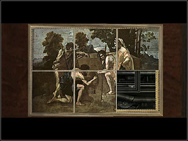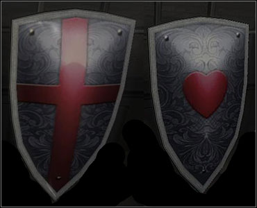 Enter the room in which Teabing awaits you. He'll tell you to solve a riddle: choose the right 2 shields and place them on the armors by the doors on each side of the room. Do so, using the screenshot below.