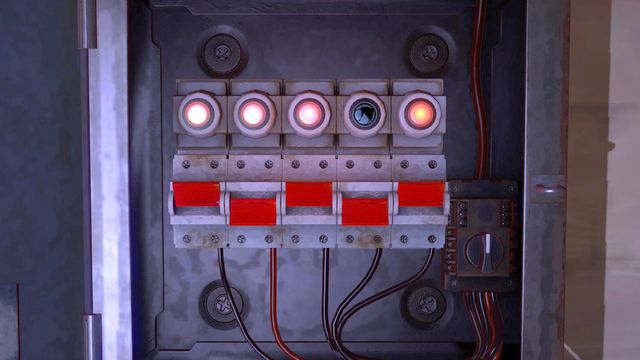 After you collect the batteries, get back for the drill and use it to gain access to the fuse box on the wall, next to the door. The above screenshot presents what you see after you open the box. Your task is to set the red switches in the manner presented there. After that, you have to use the switch on the right to power the facility.