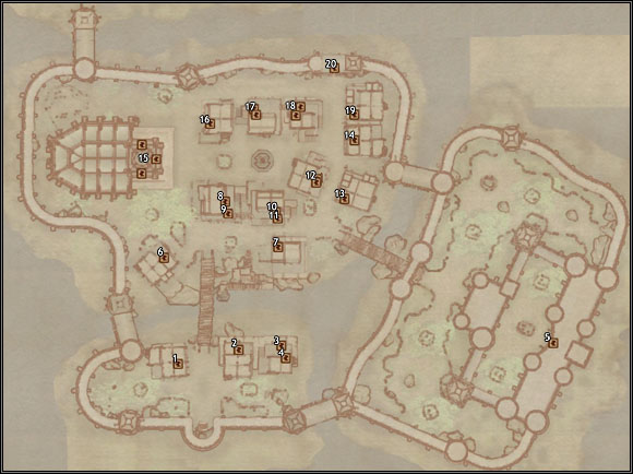 1 - The Lonely Suitor Lodge 2 - The Archer's Paradox 3 - House for Sale 4 - Luciana Galena's House 5 - Castle Bravil Great Hall 6 - Bravil Mages Guild 7 - A Warlock's Luck | 8 - Aleron Loche's House 9 - Henantier's House 10 - Skooma Den 11 - Carandial's House 12 - Dro'shanji's House / Andragil's House 13 - Fighters Guild 14 - The Fair Deal | 15 - Great Chapel of Mara 16 - Varon Vamori's House 17 - Ungolim's House / Ranaline's House 18 - City Swimmer's House / S'krivva's House 19 - Silverhome on the Water 20 - The Nibenay Valler |