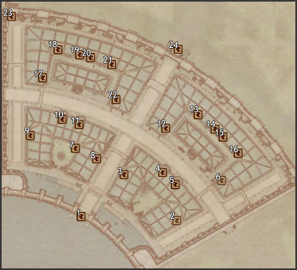 1 - Green Emperor Way 2 - The Main Ingredient 3 - First Edition 4 - The Merchants Inn 5 - A Fighting Chance 6 - Red Diamond Jewelry 7 - The Market Sewers 8 - The Copious Coinpurse | 9 - Stonewall Shields 10 - Edgar's Discount Spells 11 - Rindir's Staffs 12 - Black Horse Courier 13 - Three Brothers Trade Goods 14 - Jensine's 'Good as new' Merchandise 15 - Warehouse 16 - The Feed Bag | 17 - Divine Elegance 18 - Mystic Emporium 19 - Slash 'N Smash 20 - The Gilded Carafe 21 - The Best Defense 22 - Office of Imperial Commerce 23 - North Watch Tower 24 - City Isle |