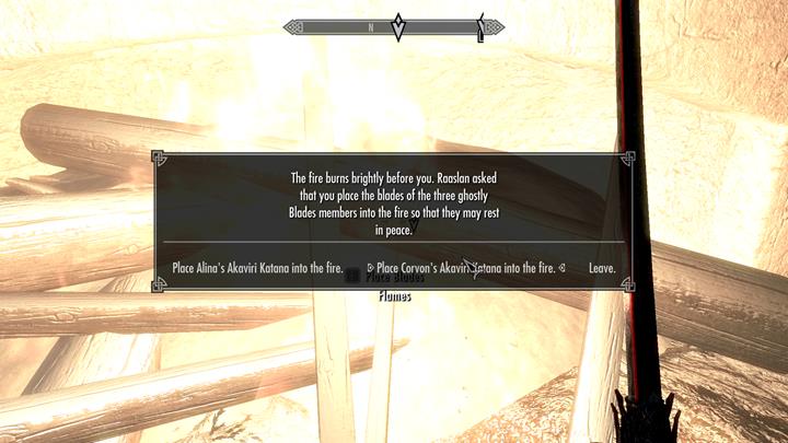 Go there and you will meet three ghosts. Raaslan asks you to throw the weapons of the fallen into fire which will grant them peace. Go to the skeletons of the fallen, take their weapons and throw them into fire. When you free all of them, Raaslan will thank you. He also gives you Glenroy's Empowered Akaviri Katana. The quest is now completed.