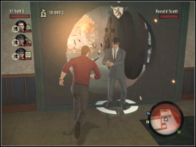 If you have entered from the front you can exit by demolishing the cracked wall - let your soldier do it [523]. After getting out, run from the police and quickly find a car [524]. Drive to your safehouse - upon entering it, the police will give up and the money will be added to your funds. Using this tactic, you can rob every bank in New York, Florida and on Cuba.