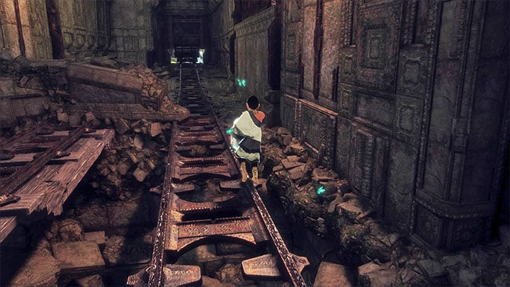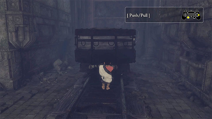 Return to the chamber behind the partially opened gate. Take interest in the second railway car (the one farther away from the gate), which has been shown in the above screenshot. Start pulling on it (be patient - the boy will take some time to put it into motion) and let it roll down.