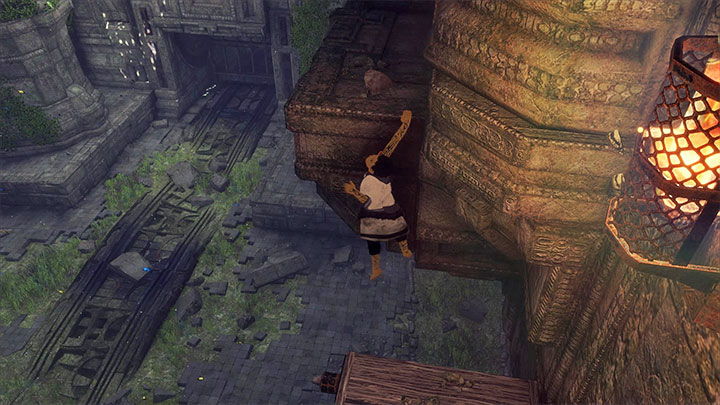 Using the lever lights up fire by one of the stone elements up above and Trico will react by leaping towards that spot. Return to the wooden stairs that you have jumped onto off the chain and jump over to the neighboring ledge shown in the above screenshot.
