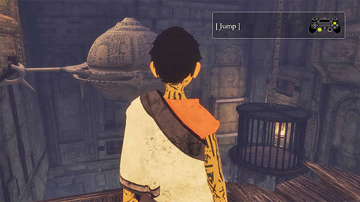 You have to reach the spot shown in the above screenshot, i.e. get to the small wooden balcony near several objects hanging under the chamber's ceiling. Jump towards the orb and jump over onto the cage hanging next to it.