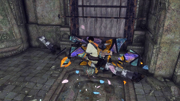 Trico will refuse to go any further, because you have ran up into two big stained glass panes. Unmount the beast, find a helmet lying on the ground and approach any of the panes. Throw the helmet at the pane to smash it. Do the same with the other one. After you are free to proceed, go ahead. You will reach a new area within the ruins, where there is a large scaffolding.