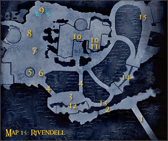 Map legend: 1 - starting area and first checkpoint; 2 - bridge leading to the front gate; 3 - front gate - area that needs to be secured; 4 - areas where enemy units show up; 5 - terrace - area that needs to be secured; 6 - signal fire; 7 - ballista; 8 - side passageway to the tower; 9 - area where you must deliver the signal fire; 10 - archives; 11 - area where Elrond appears for the first time; 12 - area where you must deliver the ring; 13 - passageway leading to the house by the water; 14 - house by the water - area that needs to be secured; 15 - area where Elrond and Legolas appear