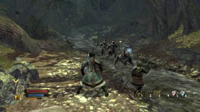 Keep going up the stream. After a while you will notice an armored orc and two orcs fighting with two weapons. Wait till they come running and then deal with them. Do the same with the next two enemies - the heavy-armored orcs.