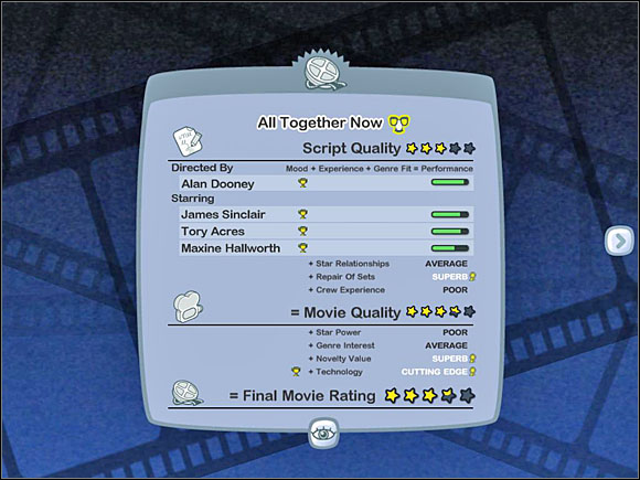 Star Performance - A very important factor indicating how well the stars did in the movie. Three elements count here: Mood, Experience, and Genre Fit. The first one has been taken care of in Nannying the Stars section. The perfect situation is when the mood bar is pulsating green, but it is difficult to achieve it without any award bonuses or, uhm, alcohol. The Experience's influence on Performance is obvious, so don't hesitate to make your stars practice a lot. Genre Fit indicates how well the star's Looks, Age and Physique fit the genre of the movie. As we said when detailing the stars' parameters, young and good looking artists are usually in a better situation, except Comedy.