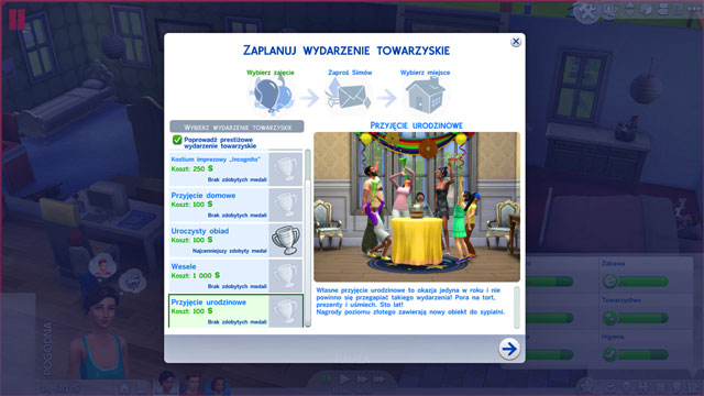 The final stage is to select the place. You can organize some of the parties in several available locations, whereas other can be organized only in one location, e.g. the house. Remember that, all in all, a party organized at home is more likely to be successful.