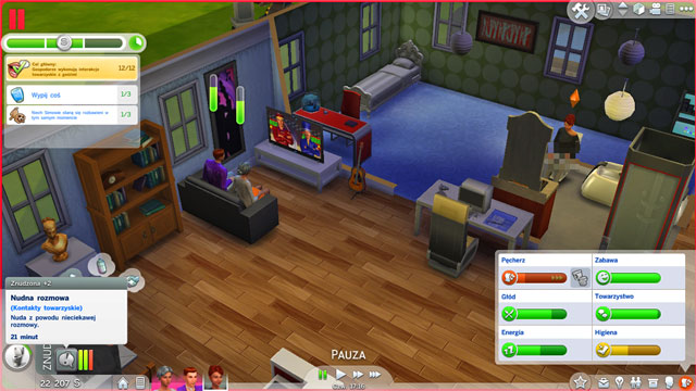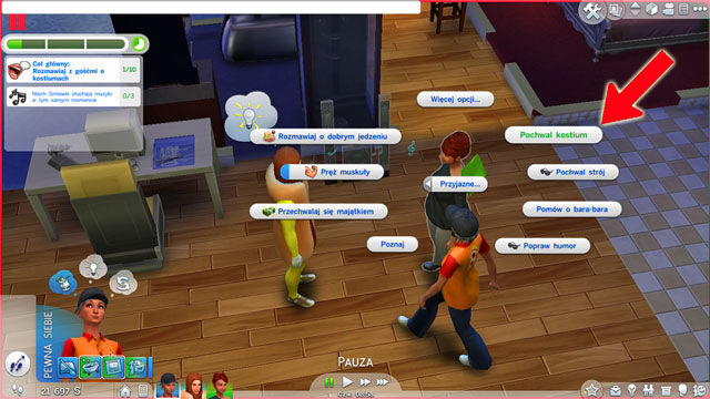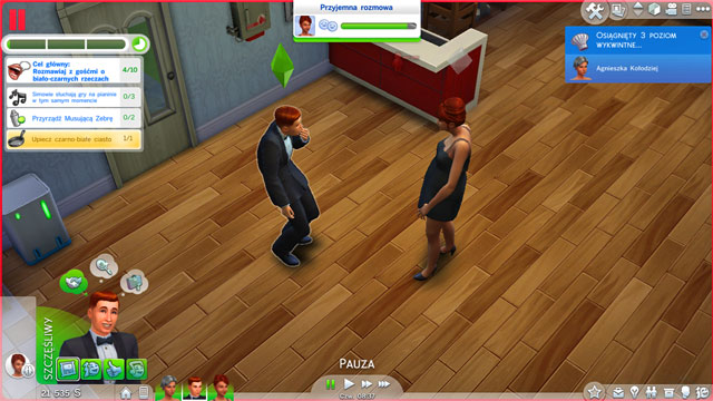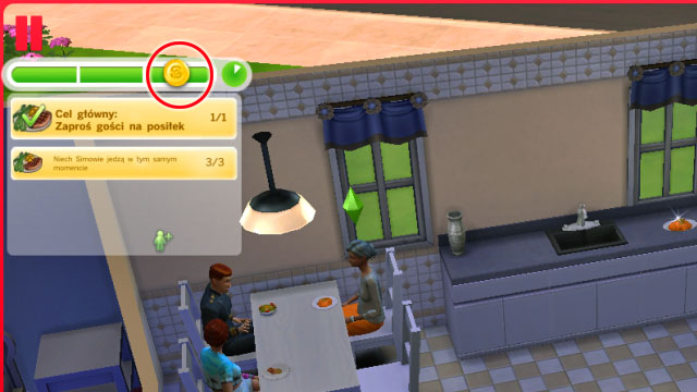 During the party, time until the end of the event, as well as all the requirements for a successful party, are displayed in the upper corner. The requirements may vary, from one type of a party to another. Often they are connected with preparation of a specific dish (e.g. the dessert or the dinner), a drink, playing on a specific instrument (piano or the guitar), doing something together (listening to music, dancing), with performing specific interactions or with getting the Sims there the specific mood (flirty, happy). Because of that - if you want to achieve all of that on your own,, including the kitchen the bar - it is best to have developed skills, such as cooking, mixiology, guitar or piano at, at least level 3-4. To dance, you need your own stereo system (the one available in the buying mode, in the salon tab). If you want to set a specific mood, you can use potions, but you do not need to. to make them cheerful, use a comedy channel on TV, to make them flirtatious, flirt around with them, etc.