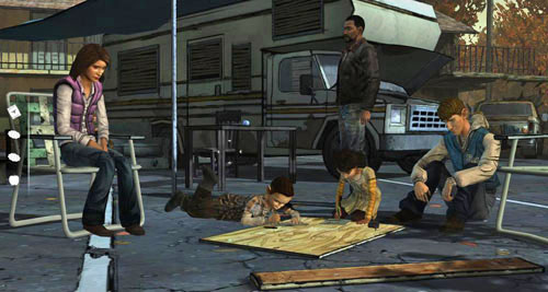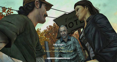 After you've returned to the motor inn, get ready for a very lively quarrel between Lilly and Kenny. It does not matter what you answer to the first question (depending on the choice you made earlier, one of the options will be "He would have died if we left him!" about David or "We're the ones that shot him." about Travis). If Carley is alive she will join the conversation. Doug, however, will remain silent.