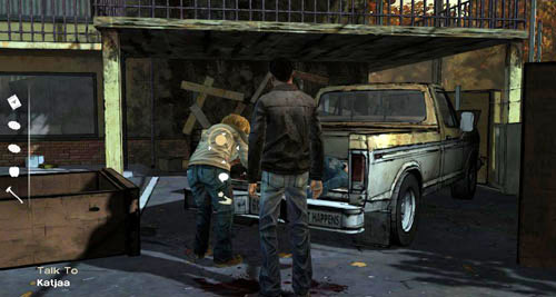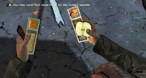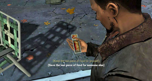 Regardless of the decision you have taken, Lilly, with or without good reason, will make you responsible for distributing the food rations among the group of your companions. It will not be easy, because there are ten people while only four food items. It's time to go around the motor inn and decide whom you'll give the food. You can hand the food out in two ways - either during the conversation (the "Want some food?" option), or by using an appropriate icon. Moreover, what you give to whom also matters, for example, Doug or Carley will accept only an apple.
