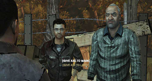 It doesn't matter with whom you'll start the conversation first. Once there are no more topics to discuss or when you try to finish it (the "Exit" option), both of them will ask you for an axe. You can either give it to Mark [GIVE AXE TO MARK] or Larry [GIVE AXE TO LARRY]. This choice has an impact on who will soon come to help you, but only if Carley did not survive.