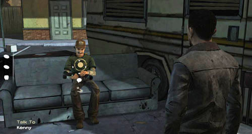 Go to the background of the screen, along the RV to talk with Kenny who is sitting on the couch. You will talk about leaving the inn and traveling by the RV. Lee will ask if he and Clementine can take a ride with Kenny.