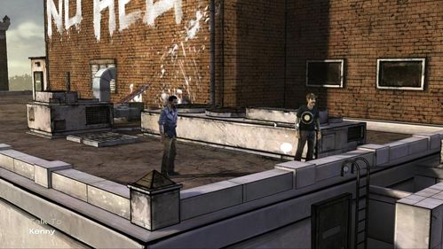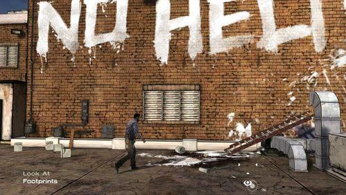 Look around the rooftop - you'll find there several interactive spots. You can look at Paint, Sign on the wall and a Ladder - it will be useful in a moment, Footprints of some poor guy.