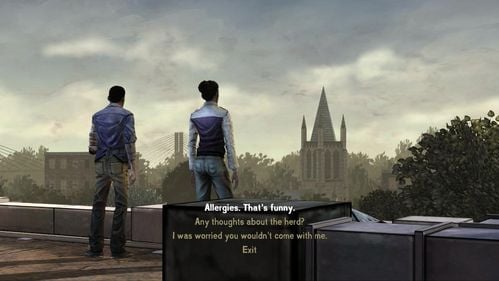You can walk to the very right, where you'll find Kenny and Fire Escape, which can be use if there were no zombies wandering at the street. You can also look at Horizon to see Crawford in a distance. If you want, you can talk to Kenny - ask him about using a bell.