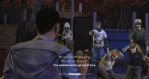 Go towards them and choose any of the options. Just talk to them until Lilly shoots their leader. Silence means death! Carley will kill two more, but at this point she will run out of ammo. Doug will manage to shoot only one bandit.