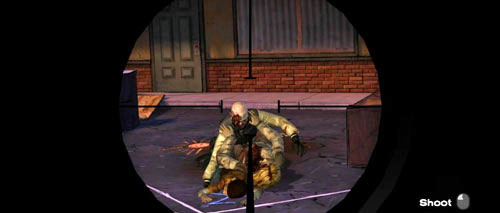 (6) The last skirmish is with the zombies. You have to kill four. If you have Carley, she will take care of the left side while you will be able to kill the ones on the right (although you can cross to be on either side). If have Doug, you need to get rid of the zombies on both sides on your own (one or two on the left, then one or two on the right, etc.). Remember to aim at the head - one accurate shot will do to eliminate a zombie (if you aim at some other part you'll have to shoot as many as four times).