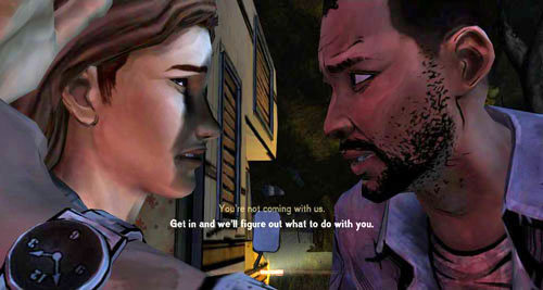 Anyway, after regaining control of Lee point at Katjaa and speak with her. You will learn that Duck was bitten. It does not matter what you'll answer. Kenny will refer to your past, and the way he will do it depends on whether you earlier told Kenny that you are a convicted murderer.