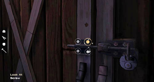 You can talk with Kenny in the barn, but it will not result in anything new. Also, trying to tell Andy to get back to Danny won't be successful - Andy will come back as soon as you try to do something about the locked door. Therefore, go left and use the Barn Door to go outside. You can talk to Lilly, if you want (there will be some new conversation topics). Most of all, however, use the wooden Gate to get through and open the Toolbox on the carpenter's table. Pull out the Multitool and then use the orange Generator on the left.