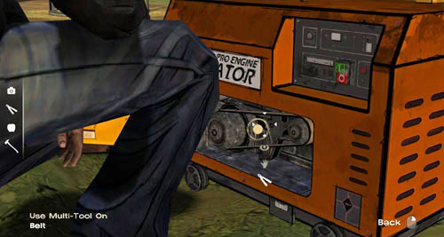 In order to get rid of Andy you must do several things. First, push the Power Switch of the generator in the upper right corner to turn it off. Next, use the Multi-Tool on the yellow Panel. Finally, use the Multi-Tool on the Belt, which Lee will hide. You can also talk with Brenda to interrupt her chat with Larry (there will be a new conversation topic). To do so, simply open the Gate. First of all, however, go back to the barn.