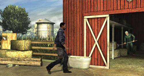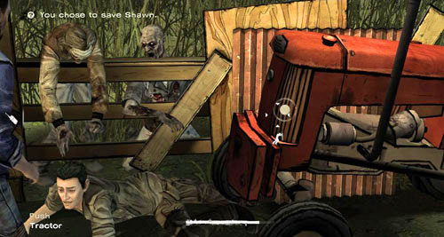 You can hit the Zombie with your fist, pick up a Board and use it to hit the zombie (you must aim properly), or pull the Tractor. It does not matter what you'll do. After a while, Kenny will come and he'll save his son, but he will be too panicked to help you save Shawn. Once again, do anything to end this scene.