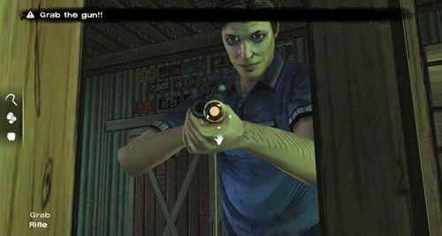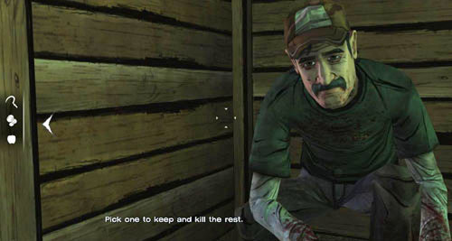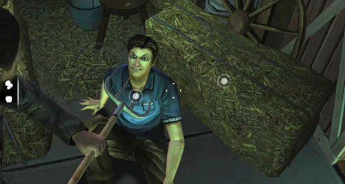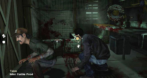 You'll find yourself in a bloody room. There are a lot of things to look at here. You can try to go back to the store through the Door on the right, but Kenny will protest. There are three weapons here (sickle, hay hook and mini cattle prod) but you can take only one. If you do not take any, soon you will need to rely on the power of your fists only. It is worth adding that if you stood on Kenny's side, he will be cooperating with you, if not - he will be ignoring you. Yet, this does not really influence the gameplay.