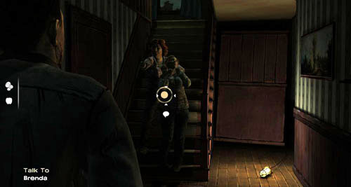 Once you stop, you'll start a conversation with Brenda by placing a cursor on her. If you tell her something unpleasant, or not say anything, she'll kill you. The correct answer will always be the first one. It's interesting to note that the answers will differ depending on whether you had a look at the diplomas and awards in the hall on the right before the dinner, or not.