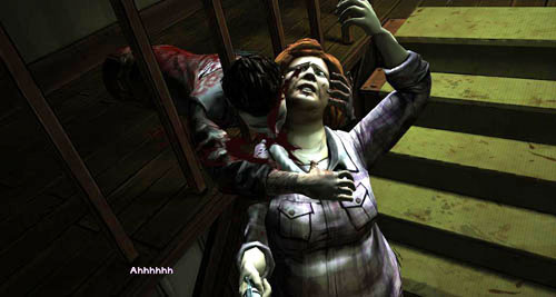 To sum up - keep going forward, stop when Brenda points at you and then choose the peaceful response. Repeat these actions until Mark - who has now got turned into a zombie - will take his revenge on Brenda.
